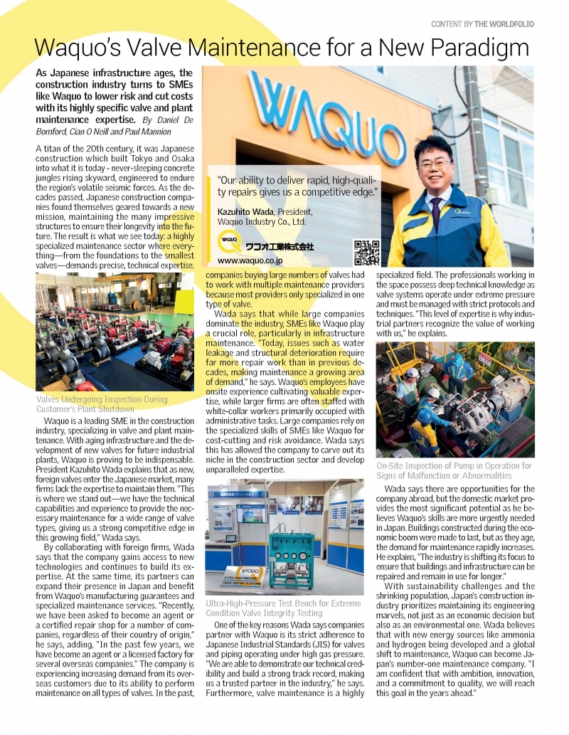 東京や大阪が眠らないコンクリートジャングルとして高層化を遂げ、地震大国ならではの厳しい耐震基準を満たす都市へと発展した背景には日本の建設業の力がある。時が経つにつれ建設会社の役割も変化し今ではこれらの構造物を長く維持するためのメンテナンスが重要な使命となっている。その結果、今日では基礎から最小のバルブに至るまで精密かつ高度な技術が求められる専門性の高い保守・点検の分野が確立されている。 ワコオ工業は建設業界における中小企業の中でもバルブおよびプラントのメンテナンスを専門とするリーディングカンパニーである。老朽化するインフラへの対応と将来の産業プラントに向けた新たなバルブ開発のニーズに対して同社の存在感は増すばかりだ。